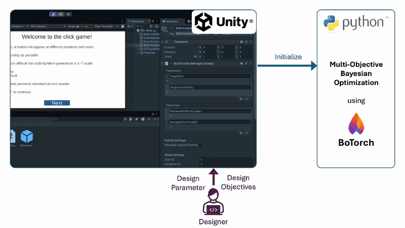 A Unity asset that simplifies access to Bayesian optimization (via BoTorch). It implements a human-in-the-loop workflow: the optimizer proposes parameter values, collects user feedback as objective scores, and iteratively updates the model to recommend the next design.