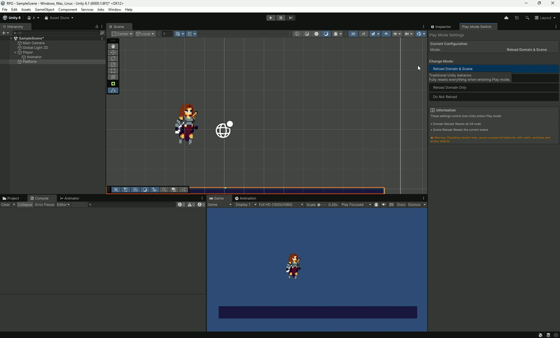Unity editor window to quickly toggle domain and scene reloading for faster Play Mode entry.